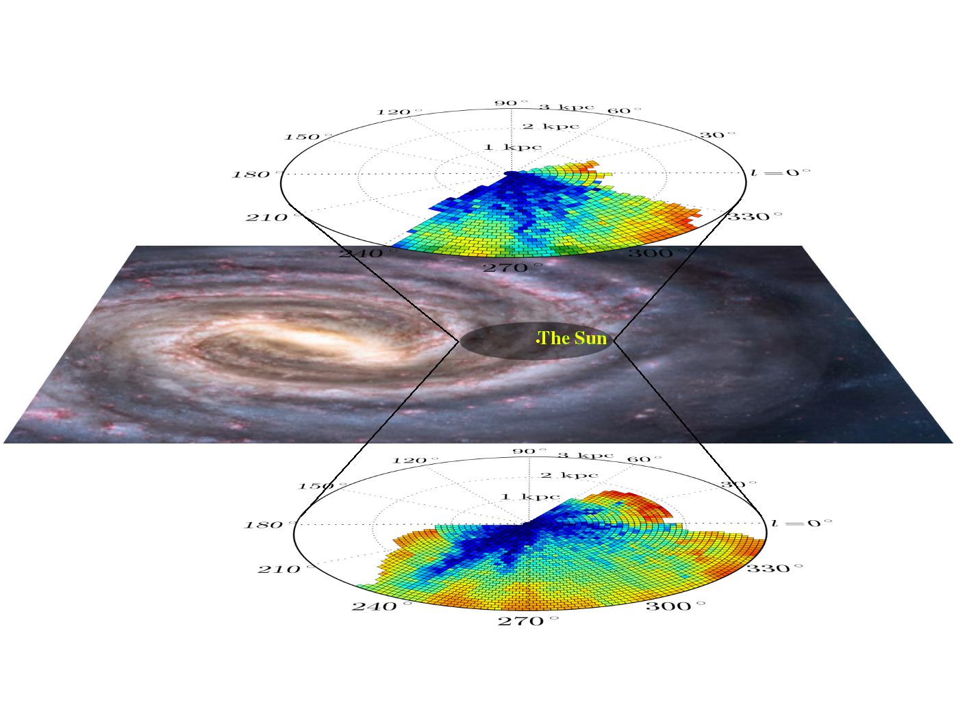 | Cartoon edge-on view of our Galaxy and volume probed by RAVE, colour-coded by the azimuthal velocity map of the RAVE targets (Kordopatis et al., 2013 MNRAS). The maximum distances probed by the Gaia-ESO survey are also indicated, for comparison purposes. |