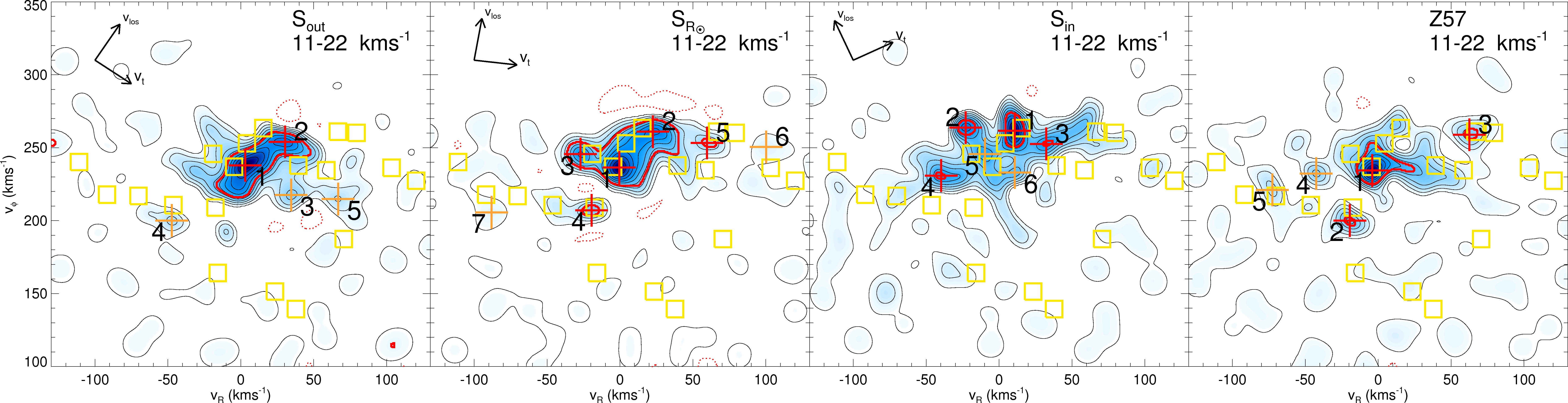 | With RAVE we have analysed the kinematic groups beyond the Solar neighbourhood for the first time. We have detected significant overdensities in the velocity distributions using a technique based on the wavelet transform. This plot shows the velocity distributions at different disk locations. The first three panels show the kinematic groups for different Galactocentric radii and the fourth plot corresponds to a region below the Galactic plane. We find that the main local kinematic groups are actually large features, surviving at least up to ˜ 1 kpc from the Sun and also at ˜ 700 pc below the Galactic plane. We also find that for regions located at different radius than the Sun, the known groups change their position on the velocity plane. These trends are consistent with dynamical models of the effects of the bar and the spiral arms. We are currently working on the modelling required to constrain the non-axisymmetric components of our Galaxy using these groups. |