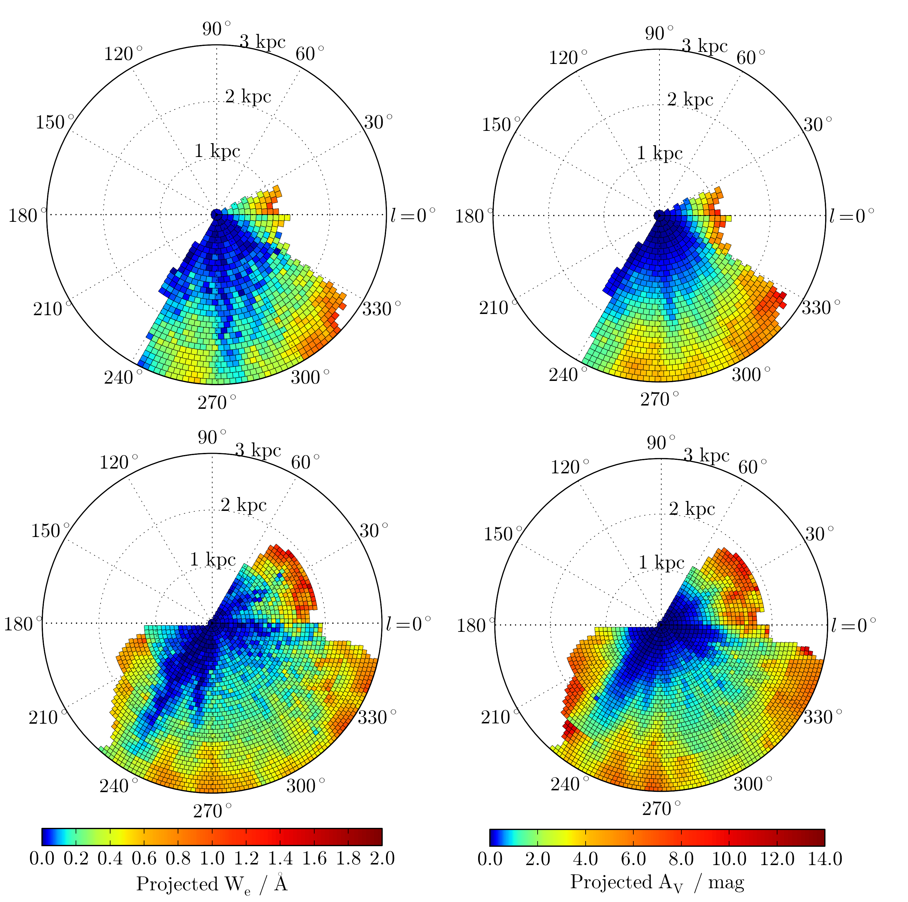 | Maps show the amount of light absorbed by the DIB (left column) and dust (right column). Red color shows more absorbed light than blue color. Top row shows the maps for the northern Galactic hemisphere and bottom row for the southern Galactic hemisphere. These maps show the value an observer in the Galactic plane would measure if he or she observed an object lying in the Galactic plane as well. This is not the case for stars observed with RAVE. They all lie at different distances away from the Galactic plane. To construct the maps, the measured DIB and dust absorption had to be projected into what we would measure if everything was in the Galactic plane. Each bin in the maps represents the measurements at a variety of Galactic latitudes projected into the Galactic plane.