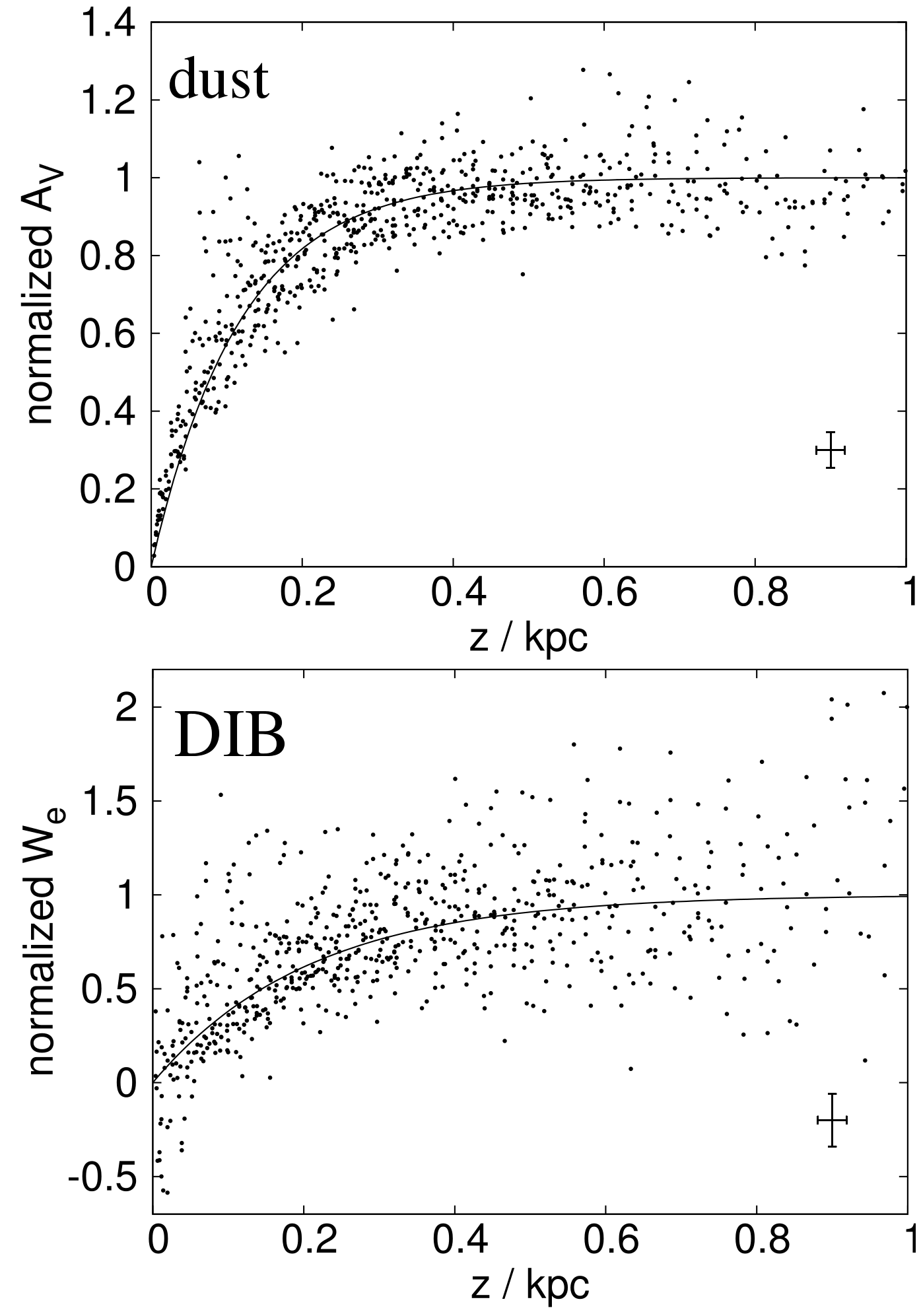 | In the direction perpendicular to the Galactic plane, the distribution of DIB carriers and dust is described by a simple exponential law, where the density of DIB carriers or dust is given by a density in the Galactic plane (at z=0) and a scale height -- a parameter describing how fast the density drops with distance perpendicular to the Galactic plane. The scale height is measured by comparing the absorbed light in regions at different distances from the Galactic plane (at different z values) independently for the DIB and dust. The measured scale heights are 381±15 light years for the dust and 681±39 light years for the DIB. Such a large difference was not expected, as DIBs and dust generally have a good spatial correlation. |